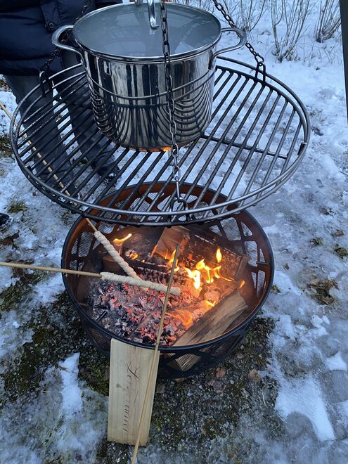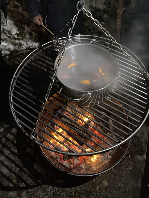 Die Feuerschale mit Dreibein wird angeheizt, darauf köchelt Glühwein. Damit und mit warmem Punsch sind kalte Hände schnell vergessen. Auf Stöcken wird Schlangenbrot über dem Feuer gebacken. Es gibt ausserdem Marroni, Zopf und eine feine Käseplatte.