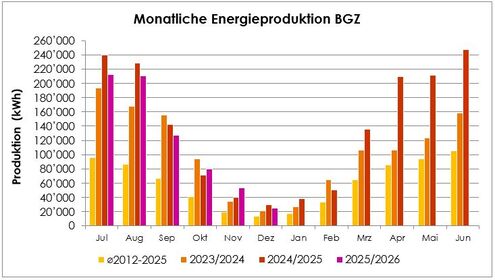 Im Solarjahr 24/25 produzierten die Solaranlagen auf den Dächern der BGZ Siedlungen insgesamt 1'652’866 KWh Strom, was eine Steigerung des Ertrags um 24% im Vergleich zum 23/24 entspricht. Mit einem Blick auf das Diagramm «Jährliche Energieproduktion BGZ» lässt sich feststellen, dass der höhere Ertrag durch den Zuwachs der Anlagen im Schuppis II und Riedacker zustande kam, welche nun erstmals für ein komplettes Solarjahr Erträge lieferten.
